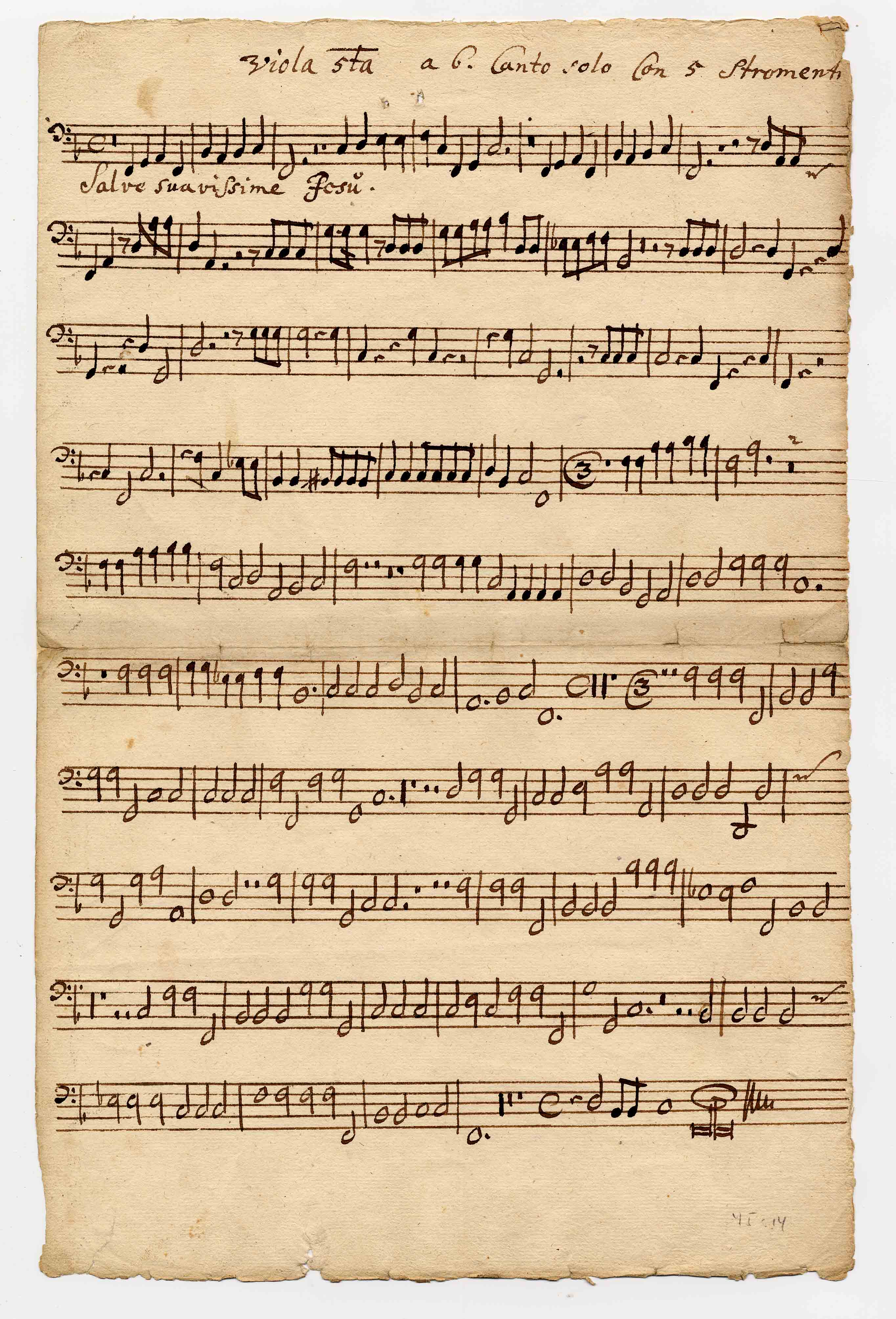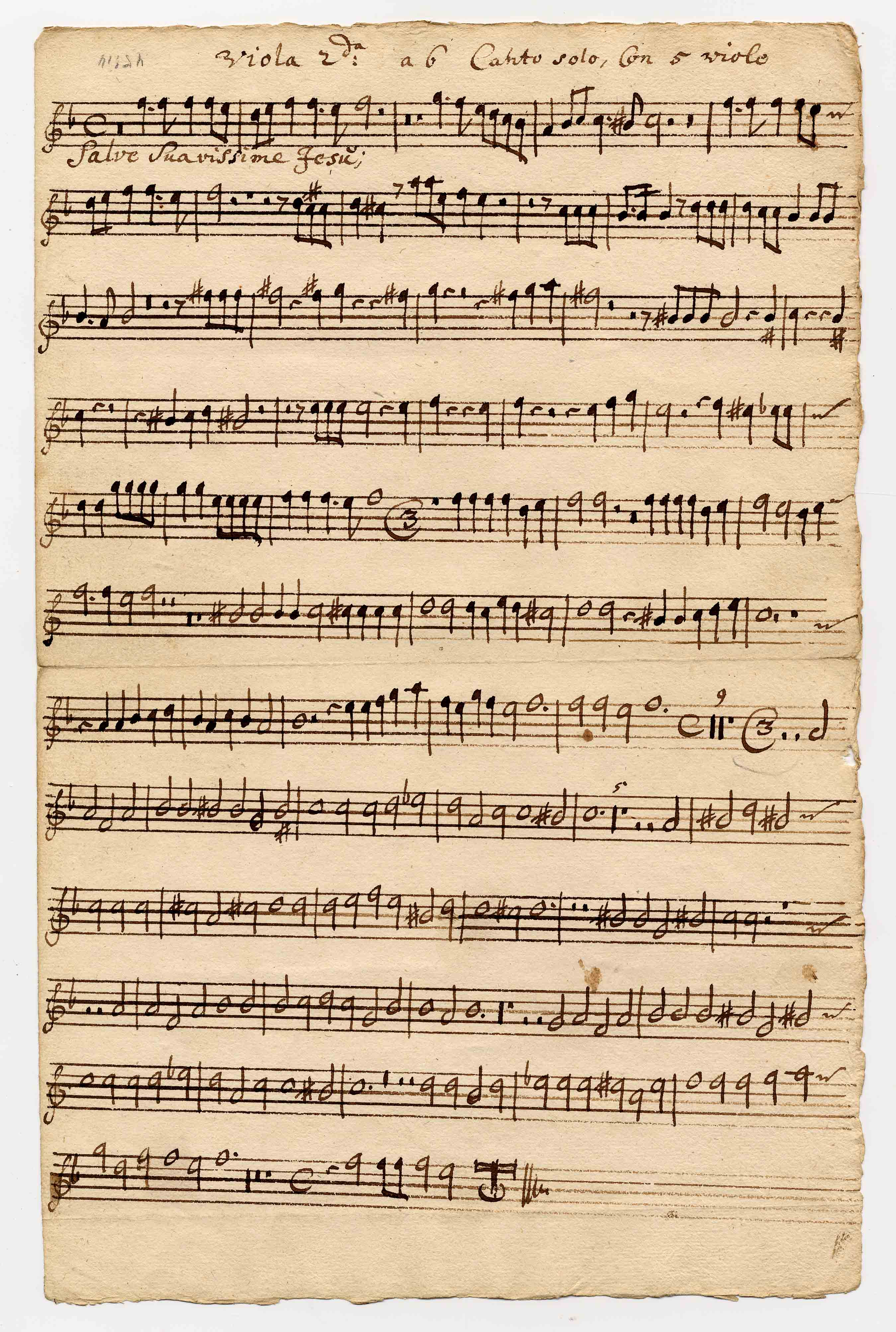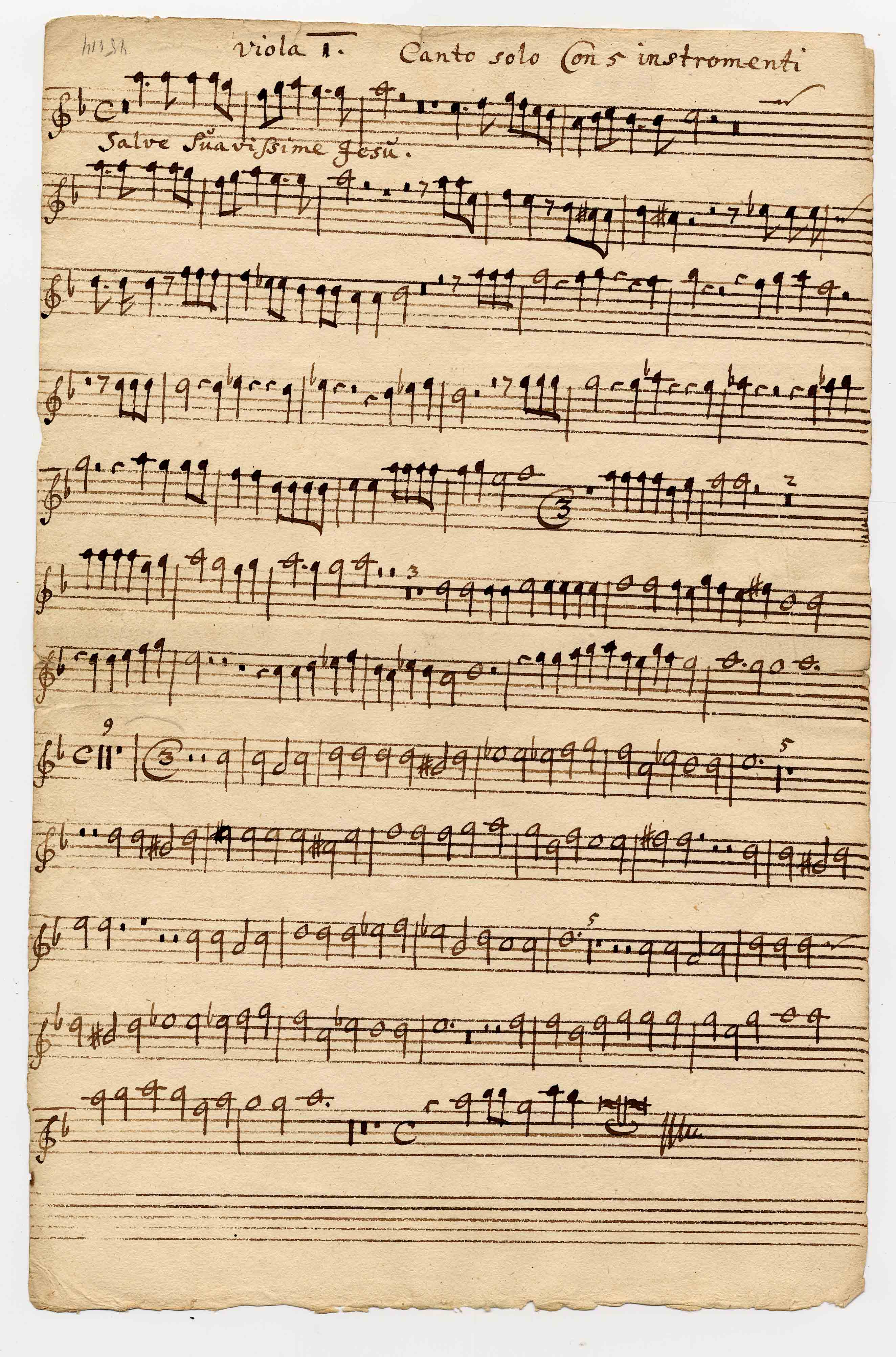Source information Shelf mark vmhs 77:22 Full title 9./ Salve Salve Sua/ vissime Jesu./ C. solo e 5 instrm. Scoring S 2vl 2vla vlne bc Tinten No 0 Original genre Original feast Literature Source comments The four last measures are written on a little piece of paper (120x60mm) fixed to fol. 25.