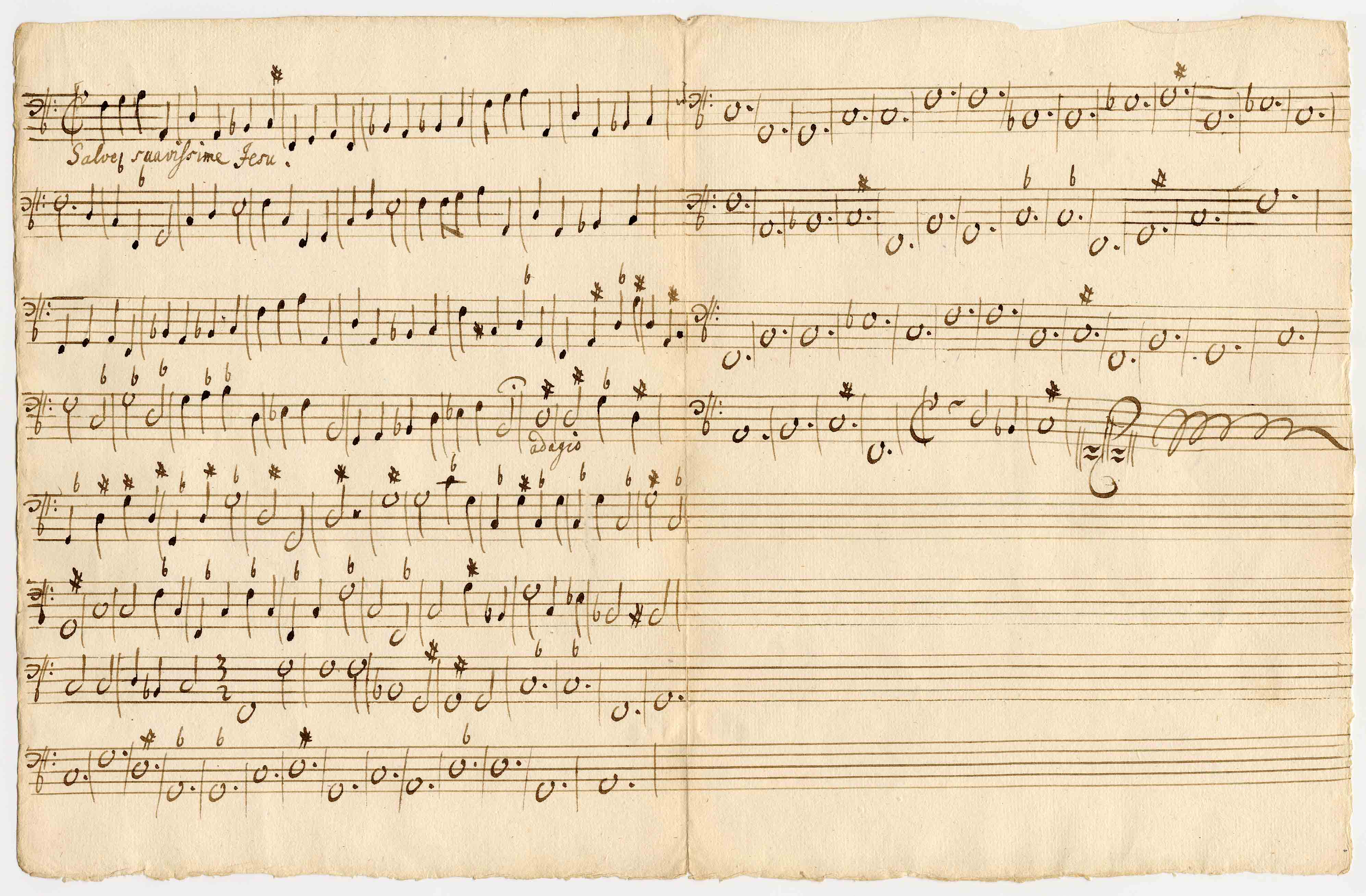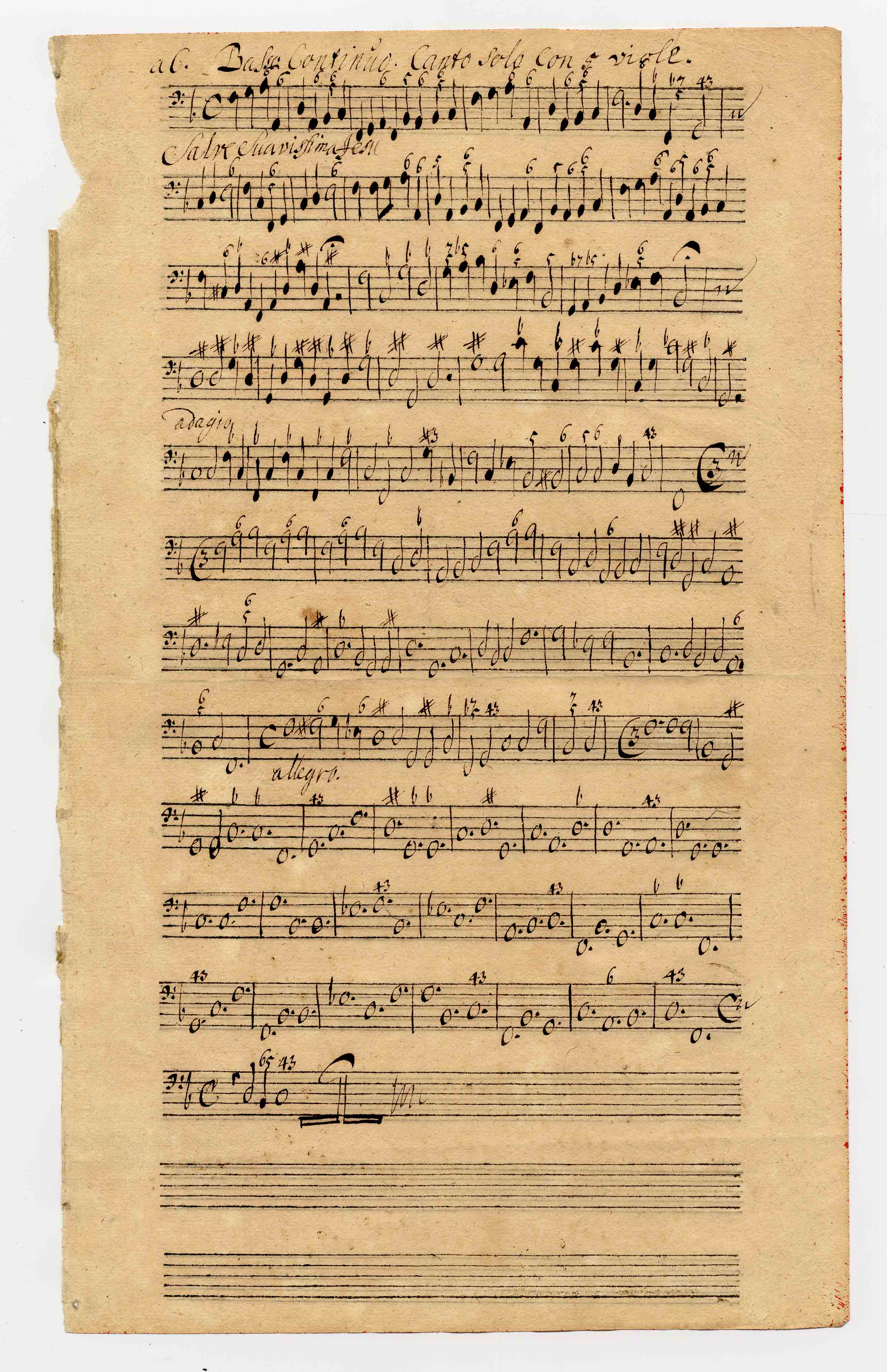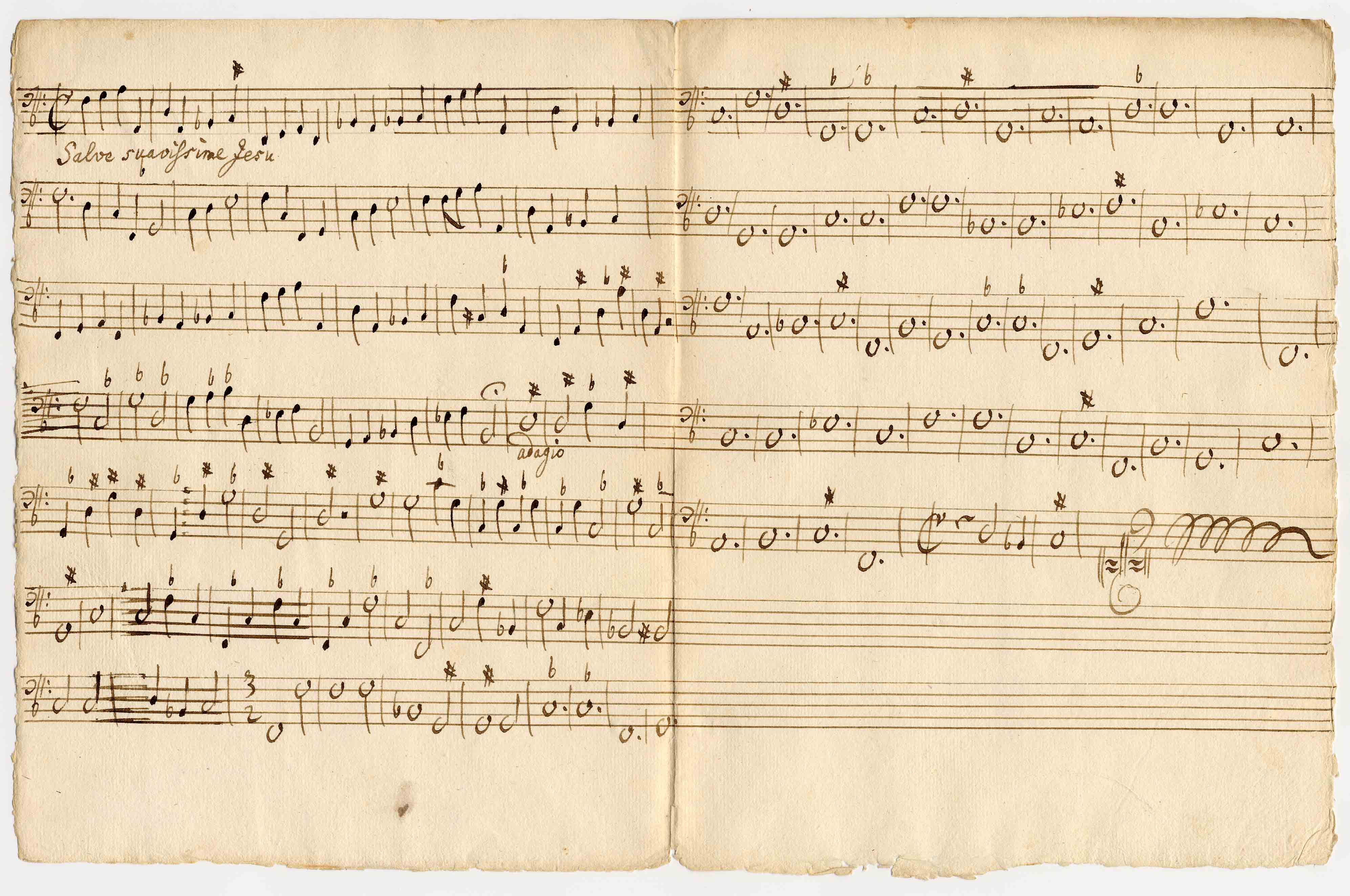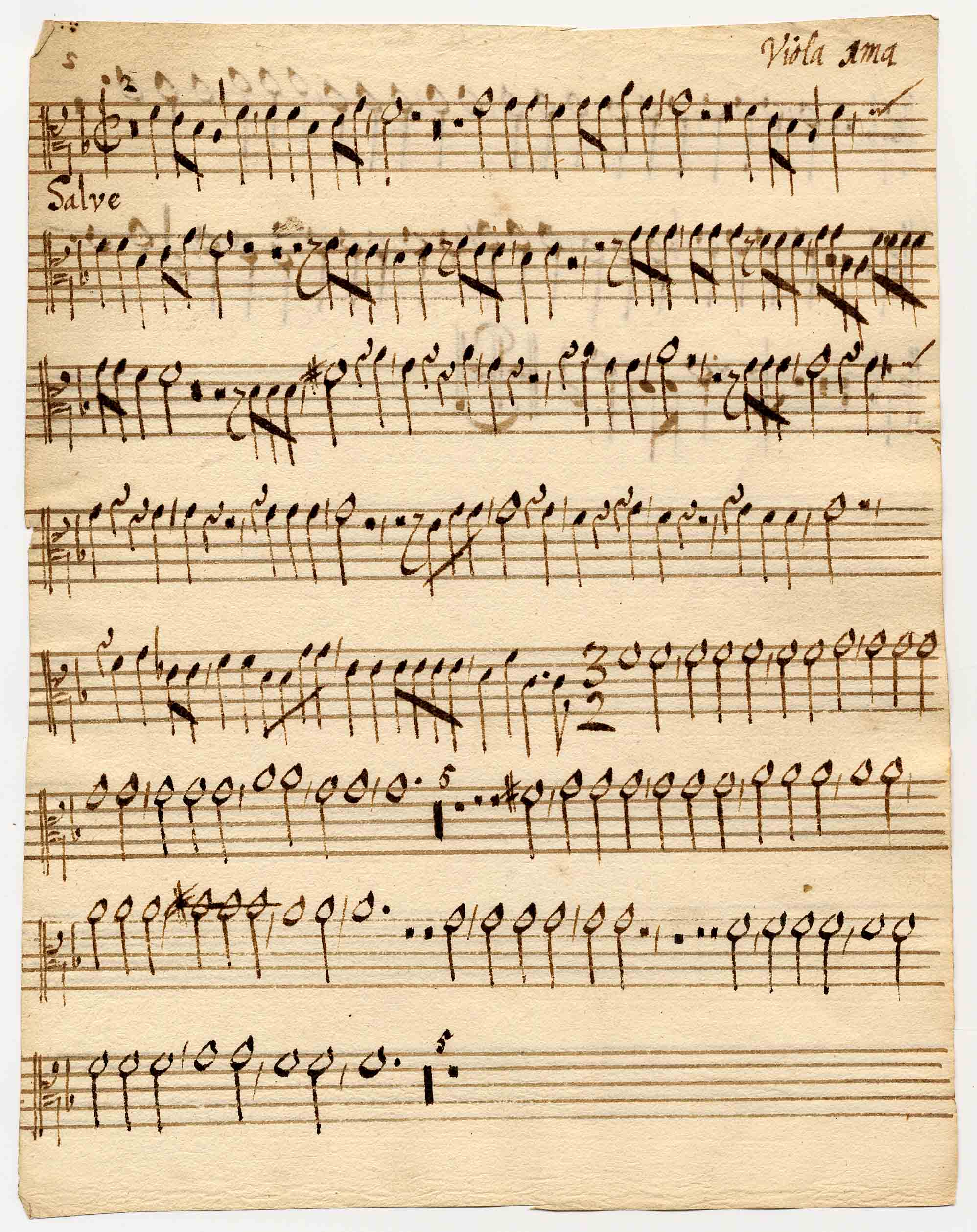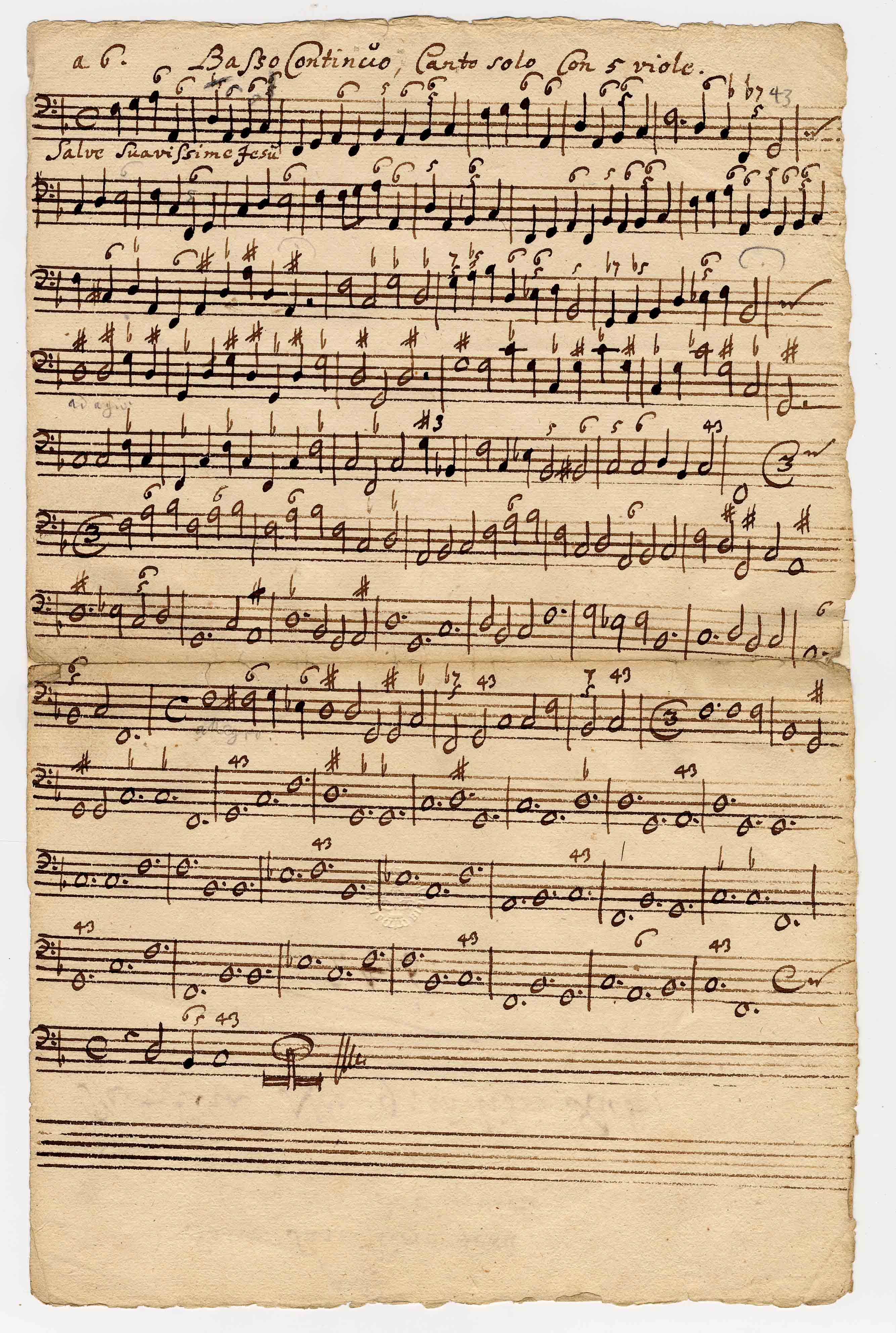 Source information Shelf mark vmhs 45:14 Full title a.6./ Salve Suavissime Jesu./ Canto solo. Con cinq[ue] viole/ Partitura No: 9: in libro Rubr:/ 24.6. Scoring S 5vla bc Tinten No 246 Original genre Original feast Literature Source comments Parts Composer Arnold, Georg (1621-1676) Full title a.6./ Salve Suavissime Jesu./ Canto solo. Con cinq[ue] viole/ Partitura No: 9: in libro Rubr:/ 24.6. Shelf mark vmhs 45:14 Part No 01 Part [S] Heading a 6 Canto solo è 5 instromenti Size 207x324 Hand GD Grusnick 1966: 79 Watermark name Amsterdam's coat of arms Watermark variant Amst - PDB Watermark date Watermark reference Comments Composer Arnold, Georg (1621-1676) Full title a.6./ Salve Suavissime Jesu./ Canto solo. Con cinq[ue] viole/ Partitura No: 9: in libro Rubr:/ 24.6. Shelf mark vmhs 45:14 Part No 02 Part viola 1. Heading Canto solo Con 5 instromenti Size 209x320 Hand GD Grusnick 1966: 79 Watermark name Foolscap Watermark variant Narr/7 - PI Watermark date Watermark reference Comments Composer Arnold, Georg (1621-1676) Full title a.6./ Salve Suavissime Jesu./ Canto solo. Con cinq[ue] viole/ Partitura No: 9: in libro Rubr:/ 24.6. Shelf mark vmhs 45:14 Part No 03 Part Viola 2:da Heading a 6 Canto solo, Con 5 viole Size 210x325 Hand GD Grusnick 1966: 79 Watermark name Foolscap Watermark variant Narr/7 - PI Watermark date Watermark reference Comments Composer Arnold, Georg (1621-1676) Full title a.6./ Salve Suavissime Jesu./ Canto solo. Con cinq[ue] viole/ Partitura No: 9: in libro Rubr:/ 24.6. Shelf mark vmhs 45:14 Part No 04 Part Viola 3:tia Heading a 6. Canto solo Con 5 instromenti Size 210x325 Hand GD Grusnick 1966: 79 Watermark name Foolscap Watermark variant Narr/7 - PI Watermark date Watermark reference Comments Composer Arnold, Georg (1621-1676) Full title a.6./ Salve Suavissime Jesu./ Canto solo. Con cinq[ue] viole/ Partitura No: 9: in libro Rubr:/ 24.6. Shelf mark vmhs 45:14 Part No 05 Part 4:ta viola. Heading a 6. Canto solo Con 5 viole. Size 211x323 Hand GD Grusnick 1966: 79 Watermark name Foolscap Watermark variant Narr/7 - PI Watermark date Watermark reference Comments Composer Arnold, Georg (1621-1676) Full title a.6./ Salve Suavissime Jesu./ Canto solo. Con cinq[ue] viole/ Partitura No: 9: in libro Rubr:/ 24.6. Shelf mark vmhs 45:14 Part No 06 Part Viola 5ta Heading a 6. Canto solo Con 5 Stromenti Size 210x325 Hand GD Grusnick 1966: 79 Watermark name Foolscap Watermark variant Narr/7 - PI Watermark date Watermark reference Comments Pencil number 190 found on the backside of this part. Composer Arnold, Georg (1621-1676) Full title a.6./ Salve Suavissime Jesu./ Canto solo. Con cinq[ue] viole/ Partitura No: 9: in libro Rubr:/ 24.6. Shelf mark vmhs 45:14 Part No 07 Part Basso Continuo Heading a 6. Canto solo Con 5 viole. Size 188x311 Hand H310 JUP Watermark name =N Watermark variant Watermark date Watermark reference Comments Composer Arnold, Georg (1621-1676) Full title a.6./ Salve Suavissime Jesu./ Canto solo. Con cinq[ue] viole/ Partitura No: 9: in libro Rubr:/ 24.6. Shelf mark vmhs 45:14 Part No 08 Part Basso Continuo. Heading a 6. Canto solo Con 5 viole. Size 188x311 Hand H310 JUP Watermark name =N Watermark variant Watermark date Watermark reference Comments Composer Arnold, Georg (1621-1676) Full title a.6./ Salve Suavissime Jesu./ Canto solo. Con cinq[ue] viole/ Partitura No: 9: in libro Rubr:/ 24.6. Shelf mark vmhs 45:14 Part No 09 Part Basso Continuo, Heading a 6. Canto solo Con 5 viole. Size 208x324 Hand GD Grusnick 1966: 79 Watermark name -- Watermark variant Watermark date Watermark reference Comments Source information Shelf mark vmhs 20:11 Full title Concerto à 5/4 Viol e Canto ò Ten: solo/Salve Suavissime Jesu/Authore/Balthasar Erben/Basso Continoo. Scoring S/T 2vl 2vla bc Tinten No 0 Original genre Concerto Original feast Literature Source comments Parts Composer Erben, Johann Balthasar (1626-1686) Full title Concerto à 5/4 Viol e Canto ò Ten: solo/Salve Suavissime Jesu/Authore/Balthasar Erben/Basso Continoo. Shelf mark vmhs 20:11 Part No 01 Part [S1] [ex 1] Heading - Size 163x210 Hand = vmhs 46:23 Rudén 1968: app 1: 103 Watermark name Fragment Watermark variant Unspecified fragment of watermark Watermark date Watermark reference Comments Text added with lead-pencil.