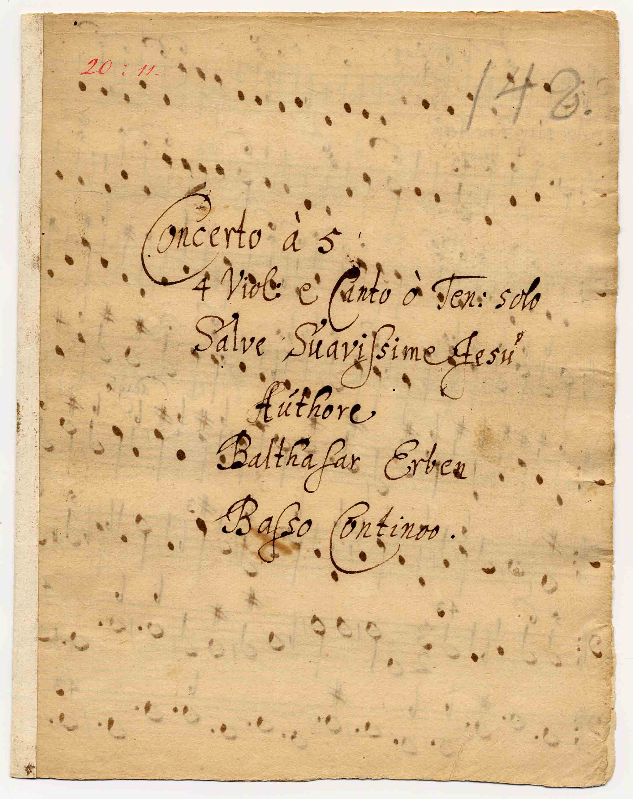 Composer Erben, Johann Balthasar (1626-1686) Full title Concerto à 5/4 Viol e Canto ò Ten: solo/Salve Suavissime Jesu/Authore/Balthasar Erben/Basso Continoo. Shelf mark vmhs 20:11 Part No 02 Part [S1] [ex 2] Heading - Size 159x203 Hand H183 Watermark name IG [= countermark] Watermark variant Watermark date Watermark reference Comments Composer Erben, Johann Balthasar (1626-1686) Full title Concerto à 5/4 Viol e Canto ò Ten: solo/Salve Suavissime Jesu/Authore/Balthasar Erben/Basso Continoo. Shelf mark vmhs 20:11 Part No 03 Part [S2] Heading - Size 164x205 Hand Carl Hintz Watermark name -- Watermark variant Watermark date Watermark reference Comments In Rudén RISM = [T]. In Rudén 1968 = S (ex. 2).