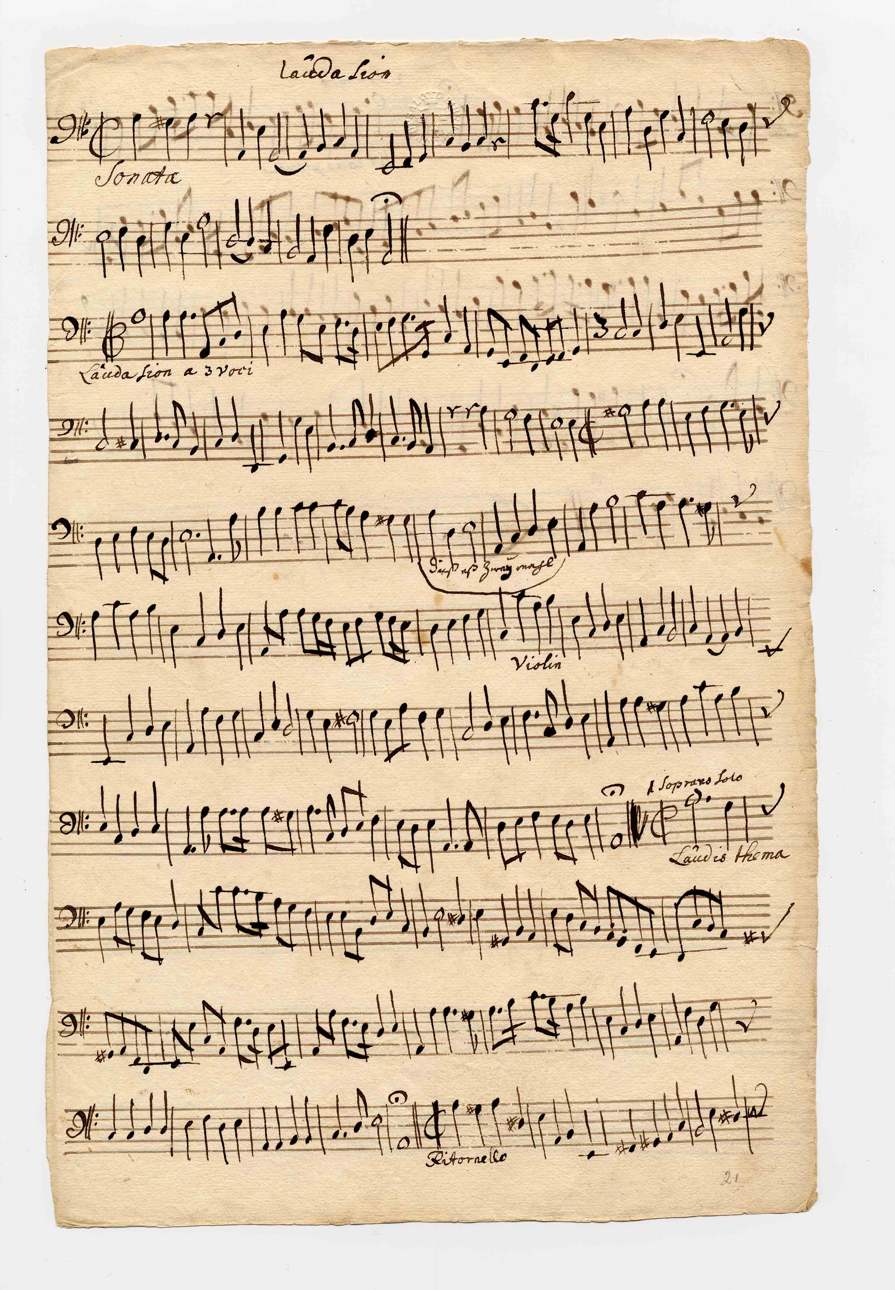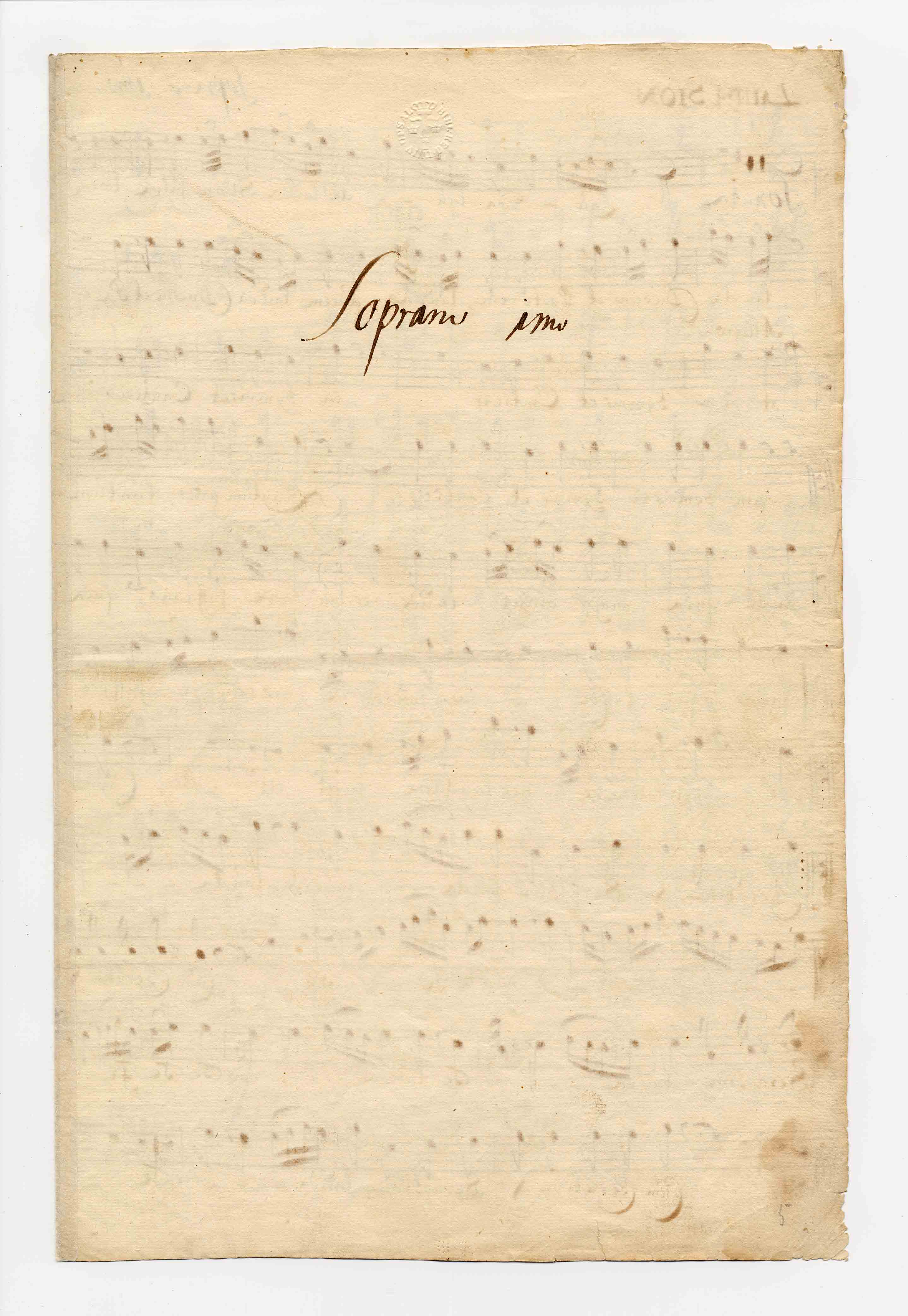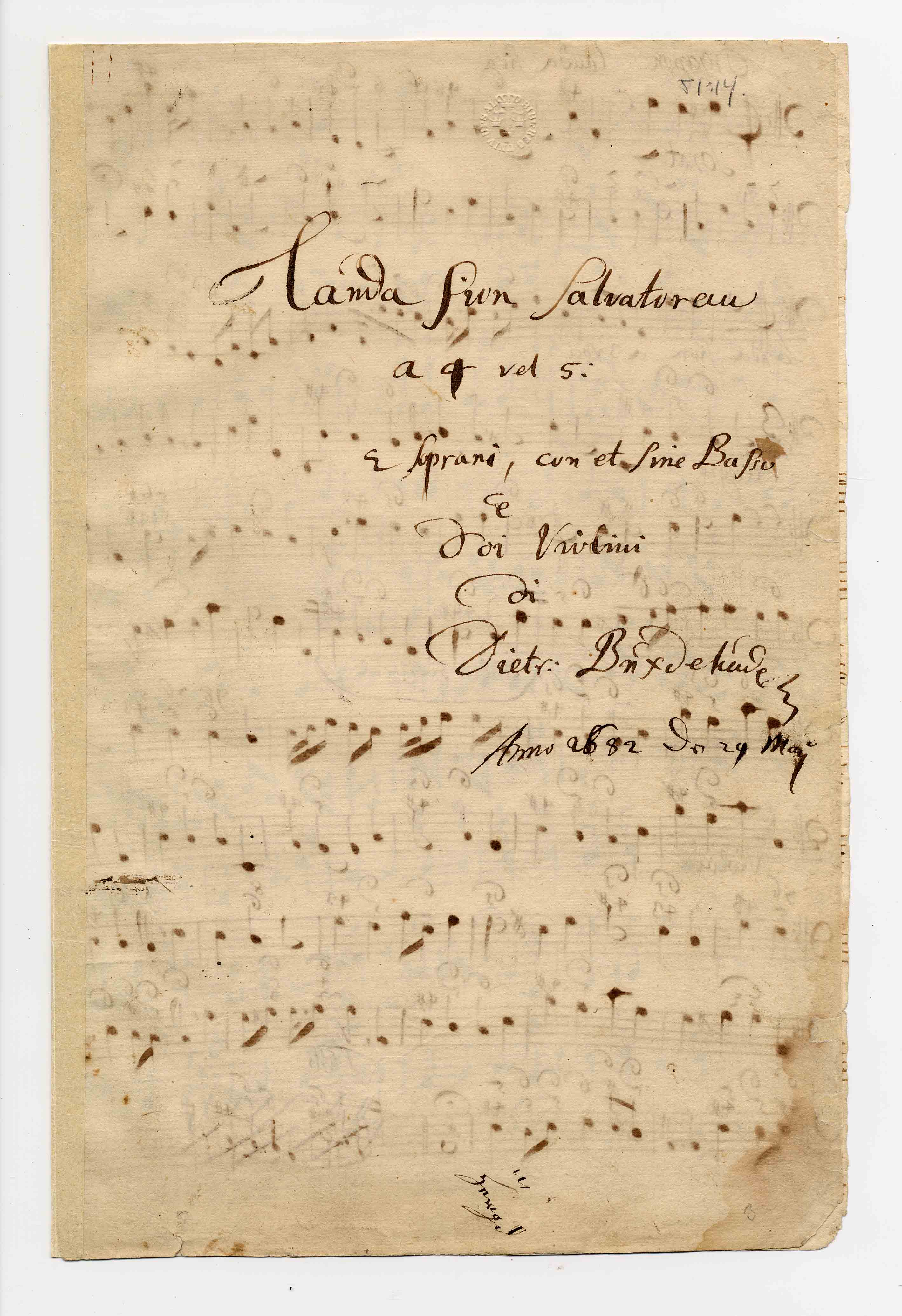 This is not an autograph; the copyist has copied even the "manu propria" sign. Composer Buxtehude, Dieterich (1637-1707) Full title Lauda Sion Salvatorem / a 4 vel 5: / 2 Soprani, con et sine Basso / è / doi Violini / di / Dietr: Buxtehude [manu propria] / Anno 1682 den 29 Maÿ Shelf mark vmhs 51:14 Part No 07 Part [bc ex 2, unfigured] Heading Size 215x333 Hand H638 JUP Watermark name Foolscap Watermark variant Narr/7 typ 12 Watermark date Watermark reference Comments The number "54" has been written on the title page with lead pencil.