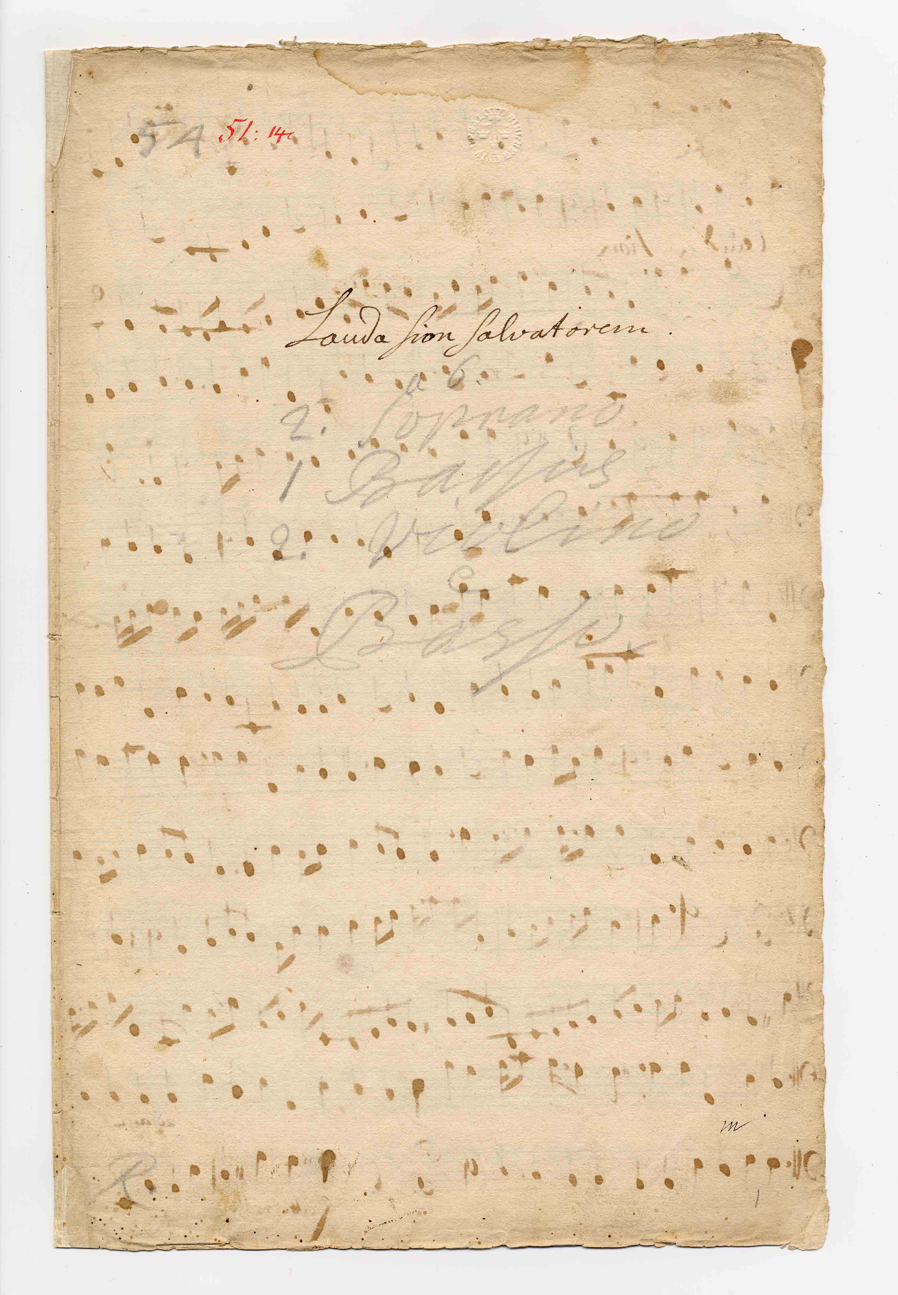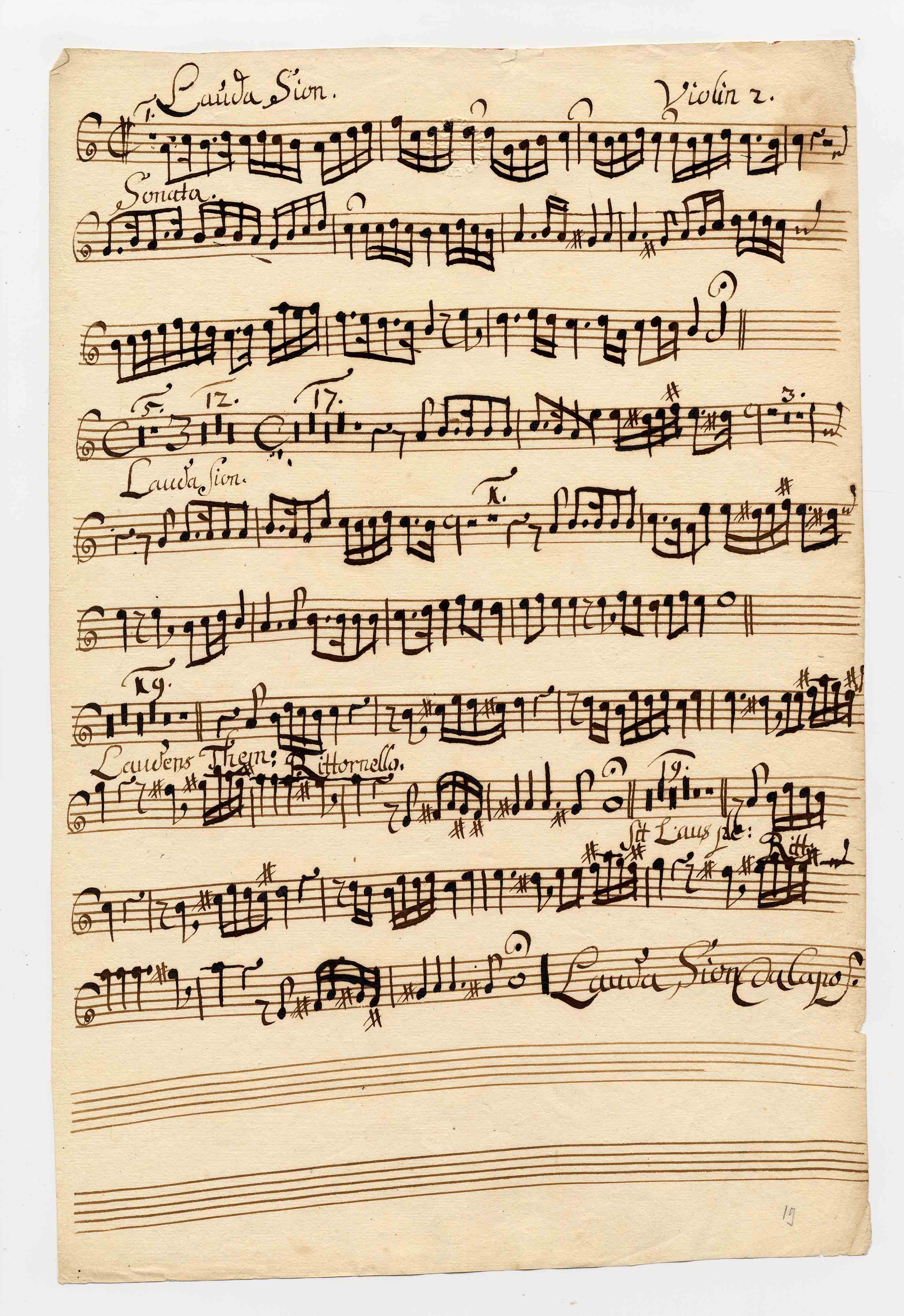 Source information Shelf mark vmhs 51:14 Full title Lauda Sion Salvatorem / a 4 vel 5: / 2 Soprani, con et sine Basso / è / doi Violini / di / Dietr: Buxtehude [manu propria] / Anno 1682 den 29 Maÿ Scoring 2S B 2vl org Tinten No 0 Original genre Original feast Literature Source comments Initially, vmhs 51:14 comprised a second set of parts. It was on loan to Carl Stiehl in Lübeck in the beginning of the 20th Century and was lost in WW2. See Lindberg 1946, p. 24. Parts Composer Buxtehude, Dieterich (1637-1707) Full title Lauda Sion Salvatorem / a 4 vel 5: / 2 Soprani, con et sine Basso / è / doi Violini / di / Dietr: Buxtehude [manu propria] / Anno 1682 den 29 Maÿ Shelf mark vmhs 51:14 Part No 01 Part Soprano 1mo Heading LAUDA SION. Size 212x323 Hand H638 JUP Watermark name Amsterdam's coat of arms Watermark variant Amst - IG Watermark date Watermark reference Comments Composer Buxtehude, Dieterich (1637-1707) Full title Lauda Sion Salvatorem / a 4 vel 5: / 2 Soprani, con et sine Basso / è / doi Violini / di / Dietr: Buxtehude [manu propria] / Anno 1682 den 29 Maÿ Shelf mark vmhs 51:14 Part No 02 Part Soprano 2do: Heading Size 207x320 Hand H638 JUP Watermark name Amsterdam's coat of arms Watermark variant Amst - IG Watermark date Watermark reference Comments Composer Buxtehude, Dieterich (1637-1707) Full title Lauda Sion Salvatorem / a 4 vel 5: / 2 Soprani, con et sine Basso / è / doi Violini / di / Dietr: Buxtehude [manu propria] / Anno 1682 den 29 Maÿ Shelf mark vmhs 51:14 Part No 03 Part Basso Heading Lauda Sion Size 209x325 Hand H638 JUP Watermark name Amsterdam's coat of arms Watermark variant Amst - IG Watermark date Watermark reference Comments Composer Buxtehude, Dieterich (1637-1707) Full title Lauda Sion Salvatorem / a 4 vel 5: / 2 Soprani, con et sine Basso / è / doi Violini / di / Dietr: Buxtehude [manu propria] / Anno 1682 den 29 Maÿ Shelf mark vmhs 51:14 Part No 04 Part Violino 1. Heading lauda Sion Size 210x323 Hand H638 JUP Watermark name Amsterdam's coat of arms Watermark variant Amst - IG Watermark date Watermark reference Comments Composer Buxtehude, Dieterich (1637-1707) Full title Lauda Sion Salvatorem / a 4 vel 5: / 2 Soprani, con et sine Basso / è / doi Violini / di / Dietr: Buxtehude [manu propria] / Anno 1682 den 29 Maÿ Shelf mark vmhs 51:14 Part No 05 Part Violin 2. Heading Lauda Sion. Size 211x318 Hand H638 JUP Watermark name Amsterdam's coat of arms Watermark variant Amst - IG Watermark date Watermark reference Comments Composer Buxtehude, Dieterich (1637-1707) Full title Lauda Sion Salvatorem / a 4 vel 5: / 2 Soprani, con et sine Basso / è / doi Violini / di / Dietr: Buxtehude [manu propria] / Anno 1682 den 29 Maÿ Shelf mark vmhs 51:14 Part No 06 Part Organon [ex 1] Heading lauda Sion Size 212x323 Hand H638 JUP Watermark name Amsterdam's coat of arms Watermark variant Amst - IG Watermark date Watermark reference Comments Pen test on the title page: the letters "hewgd" are written near the lower edge of the sheet.
