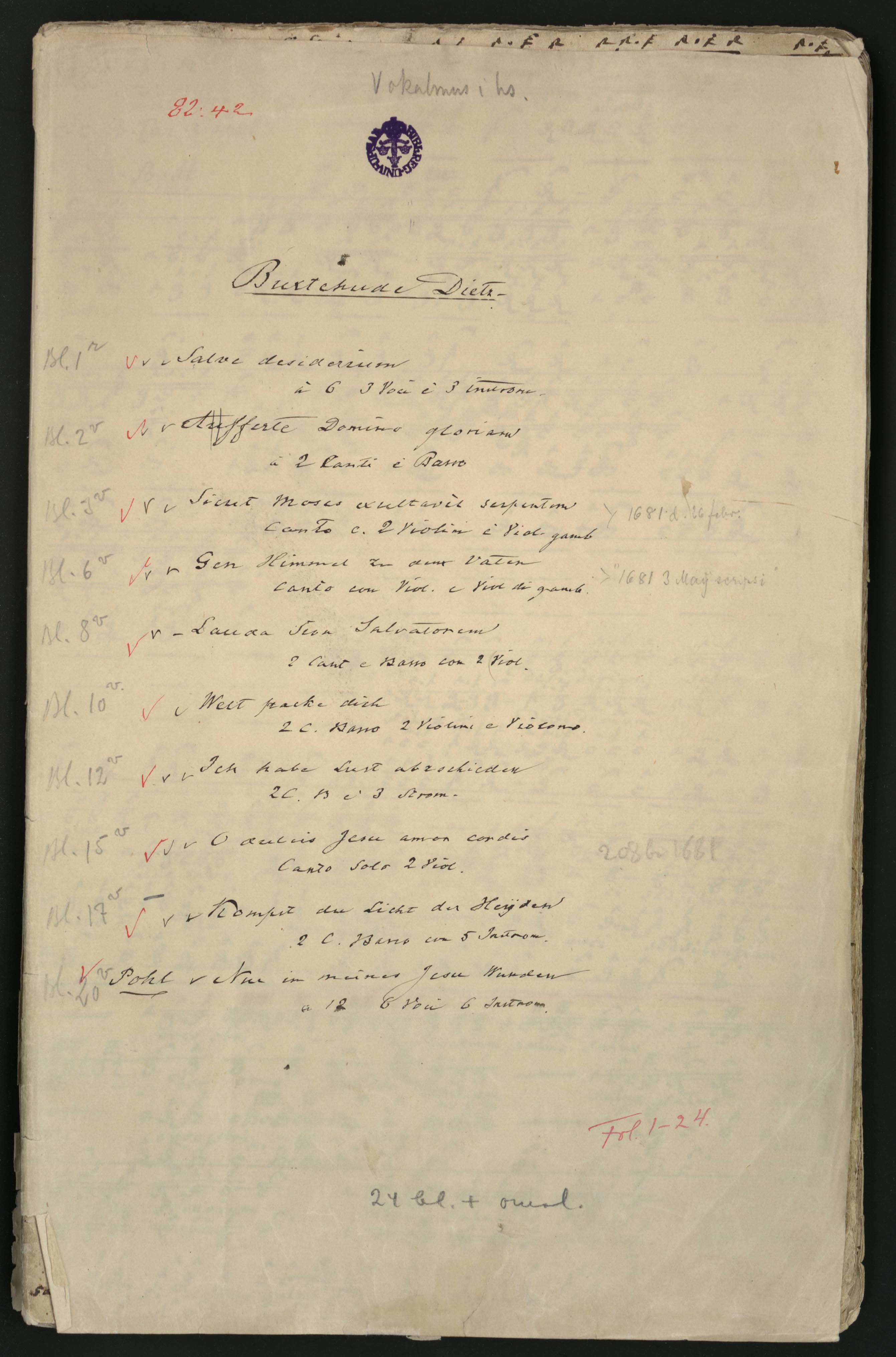 "Lead-pencil hand" has added to the title "a 6. / 2. Soprano / 1 Bassus / 2 Violino / e / Basso." Composer Buxtehude, Dieterich (1637-1707) Full title Lauda Sion Salvatorem / a 4 vel 5: / 2 Soprani, con et sine Basso / è / doi Violini / di / Dietr: Buxtehude [manu propria] / Anno 1682 den 29 Maÿ Shelf mark vmhs 51:14 Part No 08 Part [bc ex 3, unfigured] Heading Lauda Sion Size 213x330 Hand H639 JUP Watermark name Amsterdam's coat of arms Watermark variant Amst - I GAUDIN Watermark date Watermark reference Comments Source information Shelf mark vmhs 82:42 Full title Lauda Sion/ Salvatorem/ D. B. H. Scoring 2S [B] 2iv [=2vl] bc Tinten No 0 Original genre Original feast Literature Source comments Volumes Volume vmhs 82:42 Folios 24 Format 2:o Size 213x330 Gathering structure <5> + <7> Vol title Index Description No volume title, no original index. The layers are bound together with a thread. All the tabulatures are written by GD's hand. Date1 1681 Date2 1681 Date ref Rudén 1968: 165; fol. 6r, 8r, 17v Comments Date: The first <5> layer is a different paper than the second <7> layer; the first paper is dated earlier than the second both by Rudén (Rudén 1968: 165) and Grusnick (Grusnick 1966: 162). It is possible that GD started this volume about 1676 with writing in the first two pieces; then he might have left it aside for a while. On fol. 4v the ink colour and style of handwriting changes; after that the first date (1681) is set. On fol. 3r there is an alternative ending written above the original bc line with a pencil, staff notation. Sources in volume Buxtehude Afferte Domino gloriam honorem. (f. 2v-4r) Buxtehude Gen Himmel zu dem Vater mein (f. 6v-8r) Buxtehude Ich habe Lust abzuscheiden (f. 12v-15r) Buxtehude Kommst du Licht der Heiden (f. 17v-21r) Buxtehude Lauda Sion salvatorem (f. 8v-10r) Buxtehude O dulcis Jesu (f. 15v-18r) Buxtehude Salve desiderium (f. 1r-3r) Buxtehude Sicut Moses exaltavit (f. 3v-6r) Buxtehude Welt packe dich (f. 10v-13r) Pohle Nur in meines Jesu Wunden (f. 20v-24v) Watermarks wmnr Wm_name Variant Watref Cmark Comment 7 Foolscap Narr/7 - PVL typ 03 Rudén 1968: 174 PVL 63 Foolscap Narr/7 typ 09 Rudén 1968: 165 f. -